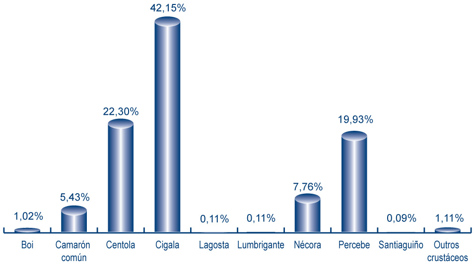 | Outros crustáceos | 17.054 | 1,11% | 18.952 | 0,07% | 1,11 |