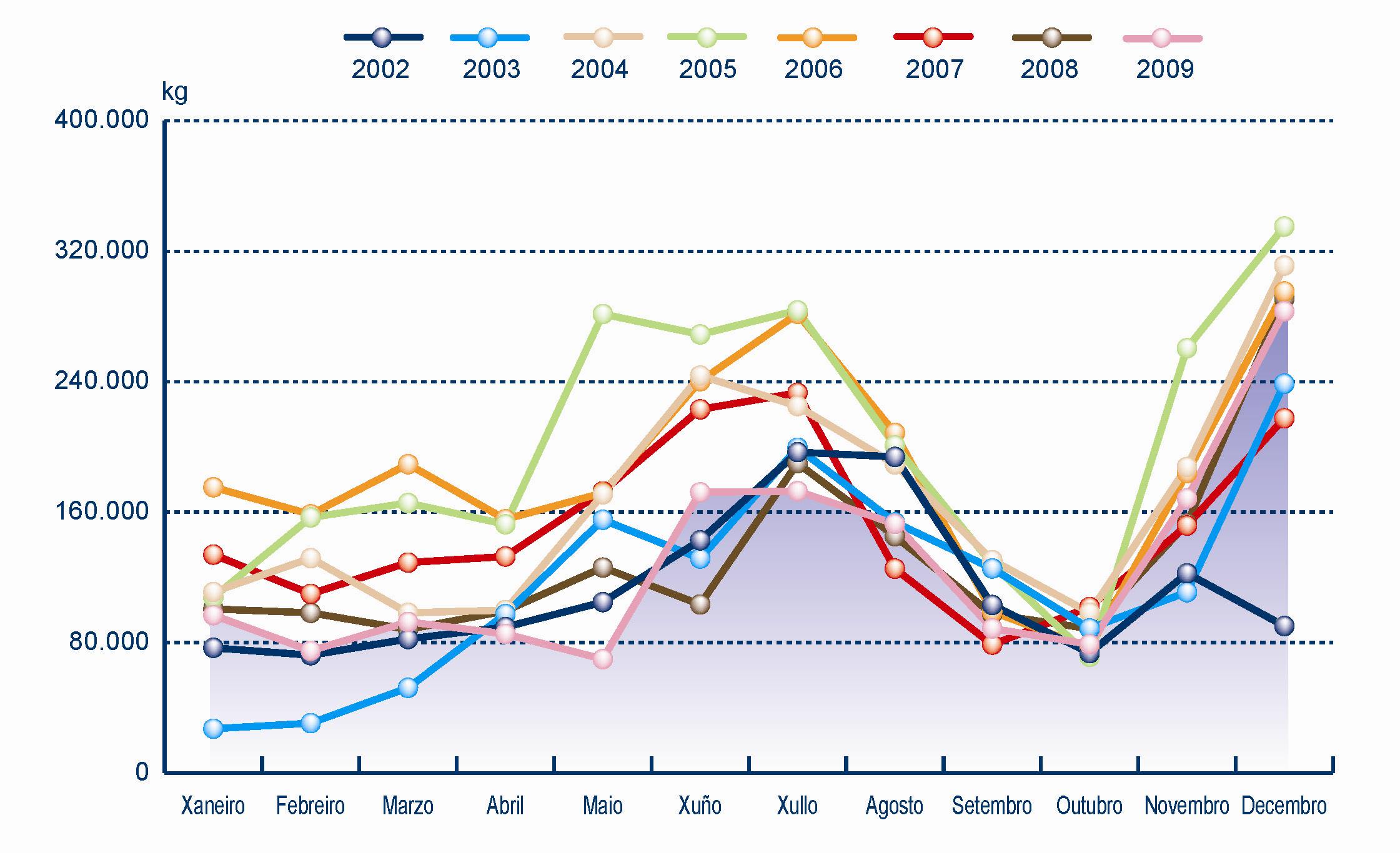|  Comparativa mensual de crustáceos no 2009 e 2008  | ||||||||