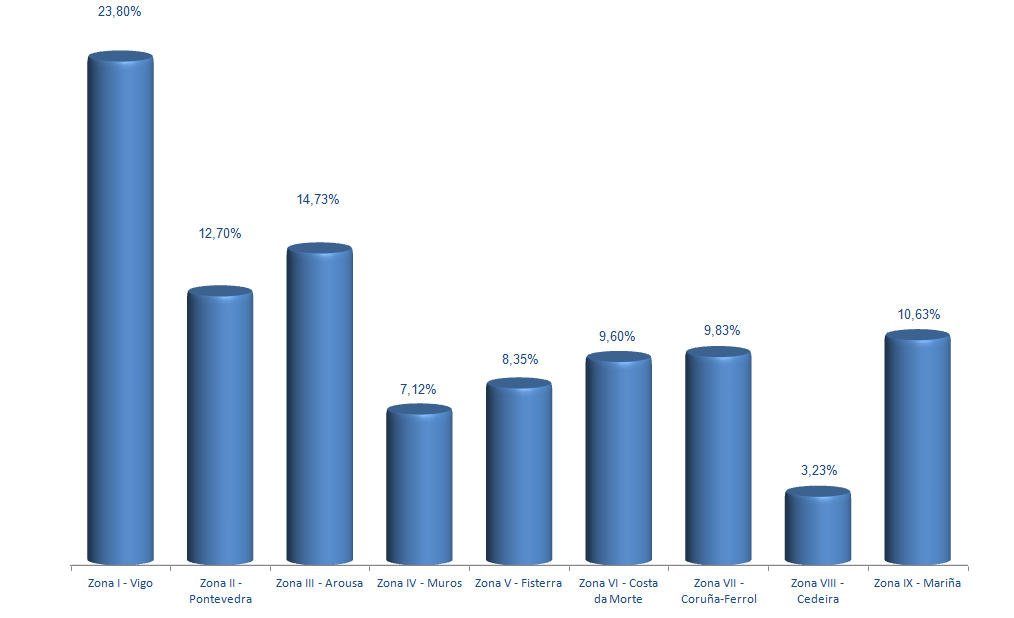 | Zona VI - Costa da Morte | 229 | 326.890 | 9,60% | 1.981.382 | 9,70% | 6,06 |