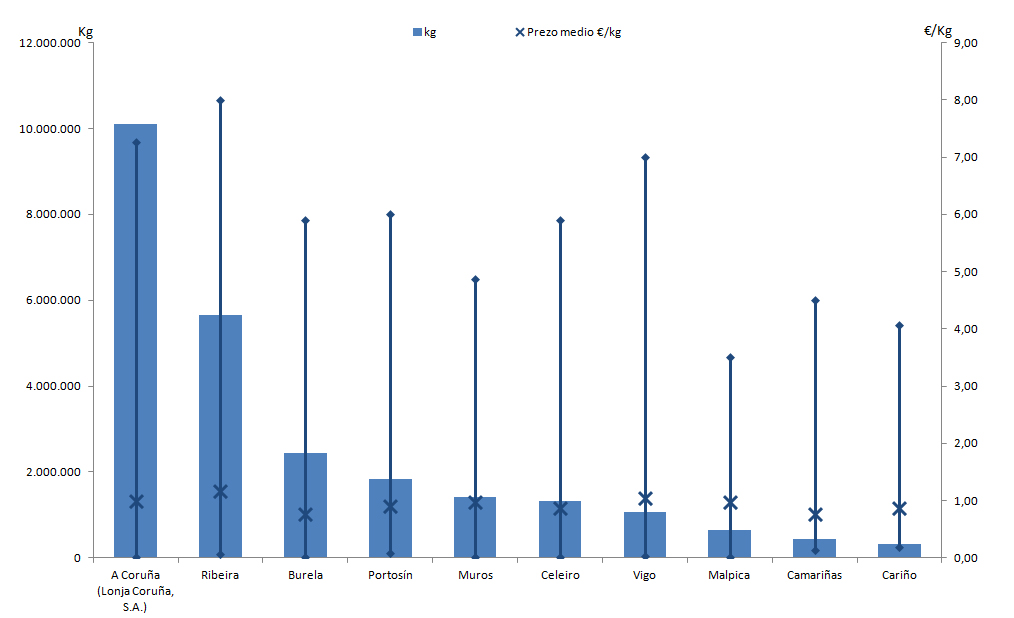 | A Coruña (Lonja Coruña, S.A.) | 296 | 10.110.692 | 38,56% | 10.019.143 | 38,26% | 0,99 |