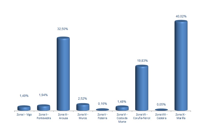 | Zona VI - Costa da Morte | 65 | 55.819 | 1,48% | 15.932 | 0,51% | 0,29 |