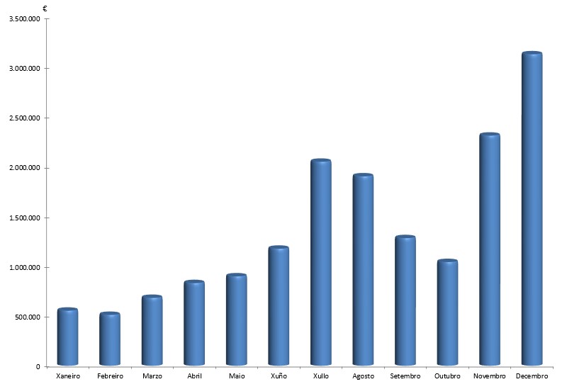 | Xaneiro | Febreiro | Marzo | Abril | Maio | Xuño | Xullo | Agosto | Setembro | Outubro | Novembro | Decembro | Total | |