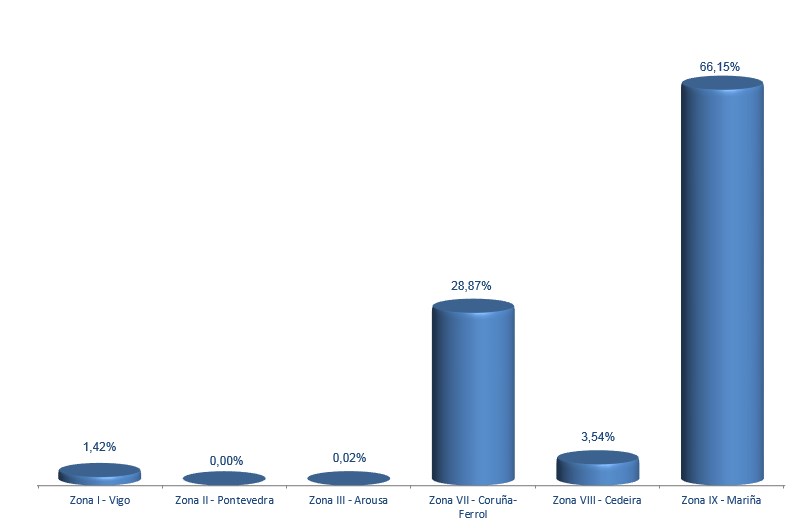 | Zona VIII - Cedeira | 21 | 100.813 | 3,54% | 440.058 | 3,78% | 4,37 |