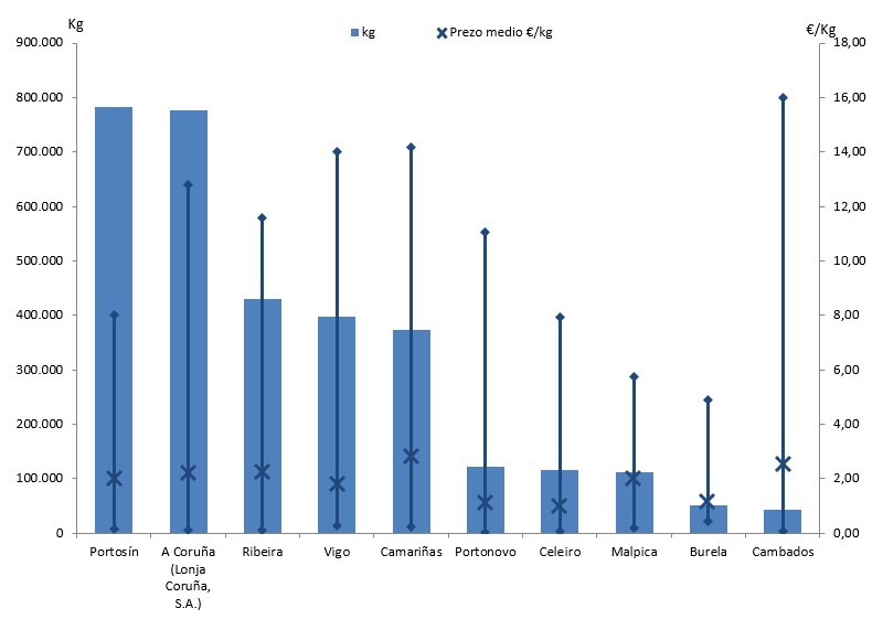 | A Coruña (Lonja Coruña, S.A.) | 134 | 776.567 | 23,48% | 1.731.804 | 24,85% | 2,23 |